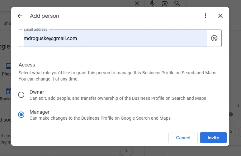 Click the Invite button (or "Send invitation"). Google will send us an email. Once we accept, you will see us listed as a Manager on your profile. You are done!
